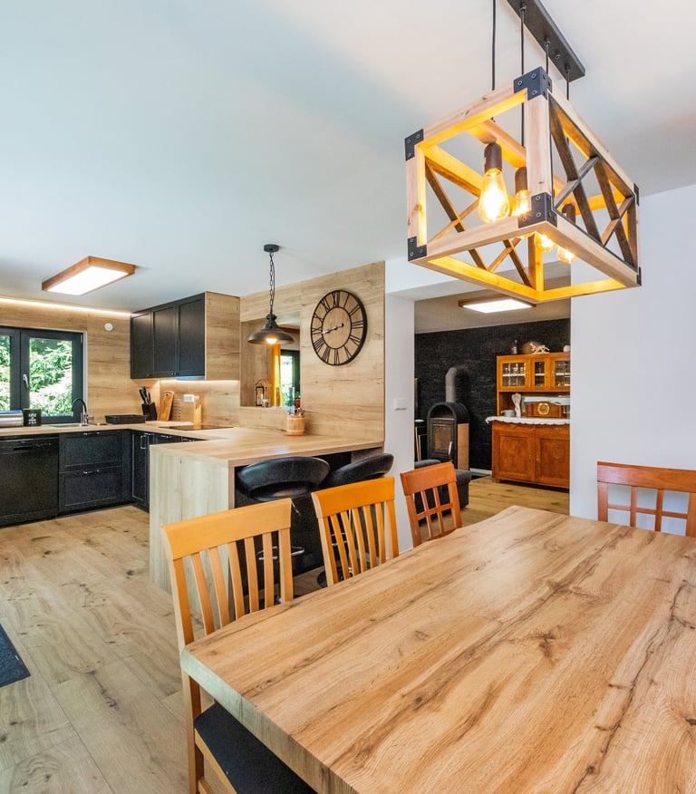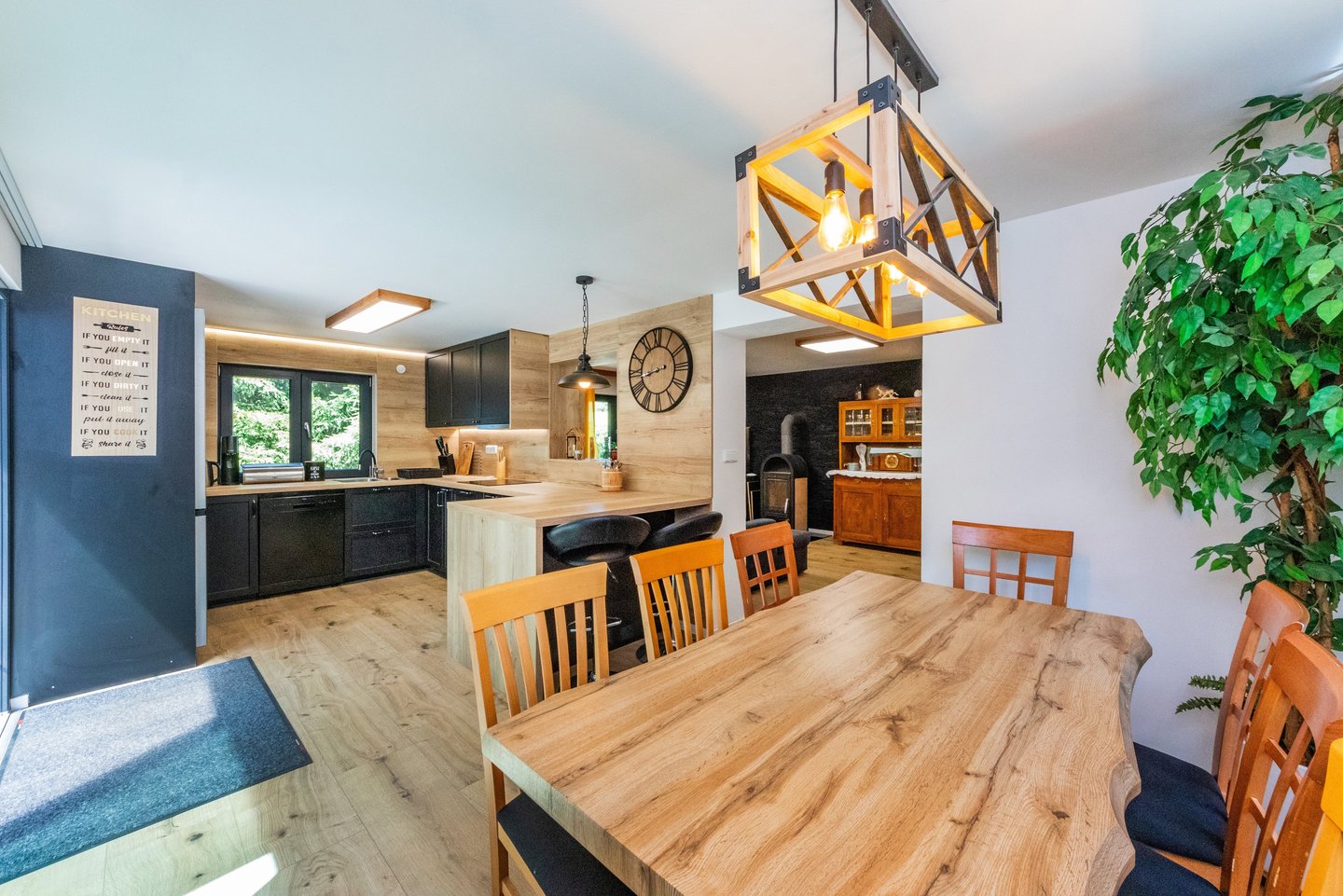 Kuchyně je plnohodnotně zařízená všemi elektronickými spotřebiči a kuchyňským vybavením. Na kuchyň přímo navazuje jídelní část s masivním stolem a židlemi. Velké posuvné dveře, které jsou součástí kuchyně slouží pro průchod na zastřešenou terasu, ze které je vidět na venkovní pergolu, ohniště, spodní i horní zahradu.