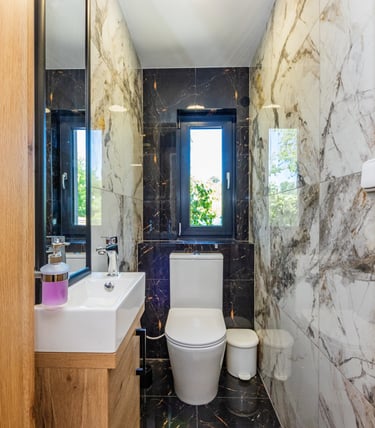 Celkem 3 koupelny a 3 toalety: 2x samostatná toaleta, 2x samostatná koupelna (1x se sprchovým koutem, 1x s vanou), 1x koupelna spojená s toaletou.