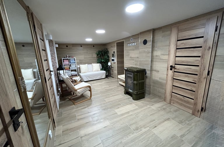 Na saunu navazuje relaxační místnost s pohodlnými křesly a pohovkou, kterou lze využít také jako přistýlku pro dvě osoby. Atmosféru doplňují krbová kamna a komfort zajišťuje podlahové topení.